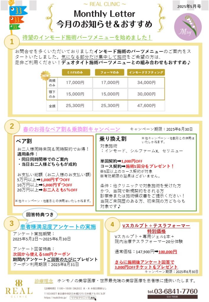 皆さまこんにちは♪ REALCLINICです!本日は5月キャンペーンについてお知らせいたします😍