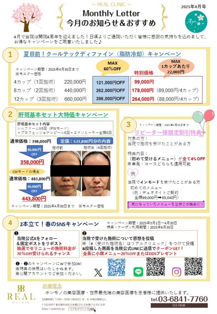 皆様こんにちは。リアルクリニックです♪本日は4月のキャンペーンについてお知らせいたします✨ リアルクリニックは4月3日で開院4周年👏…