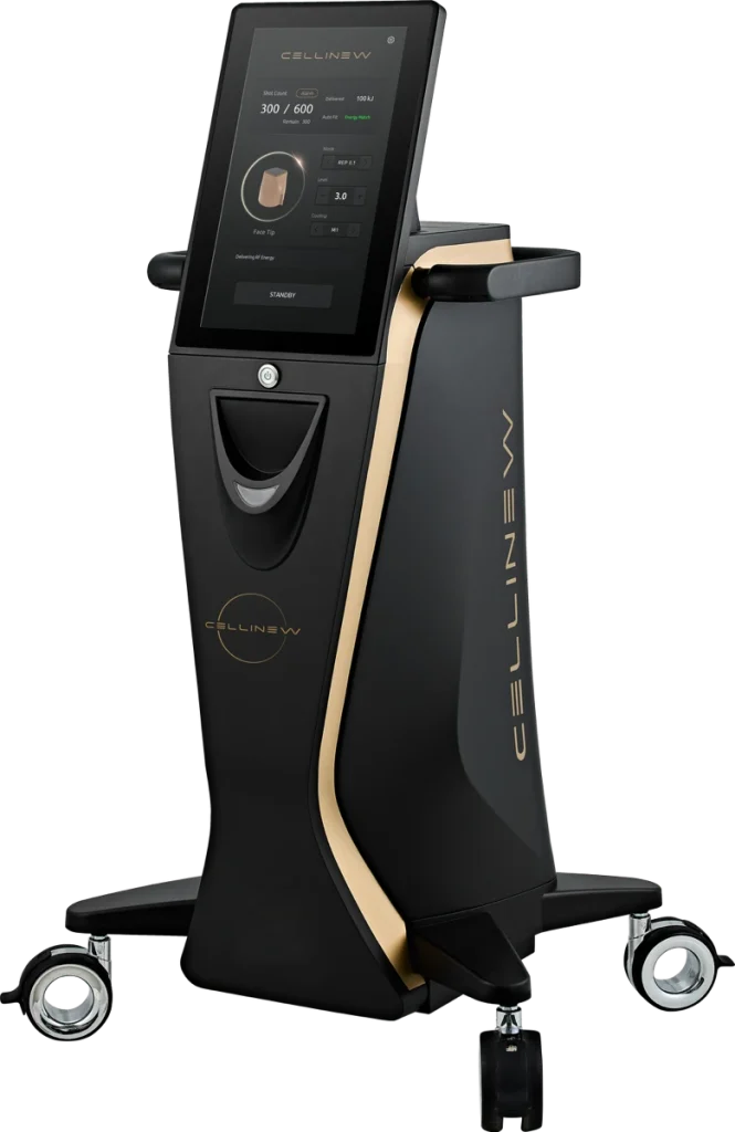 CELLINEW(セリニュー)は、お肌のたるみやシワを業界最高出力の6.78MHzのRF(高周波)を皮膚深部まで照射して、強力な皮膚のタイトニングをおこなう最新のモノポーラRFたるみマシンです。