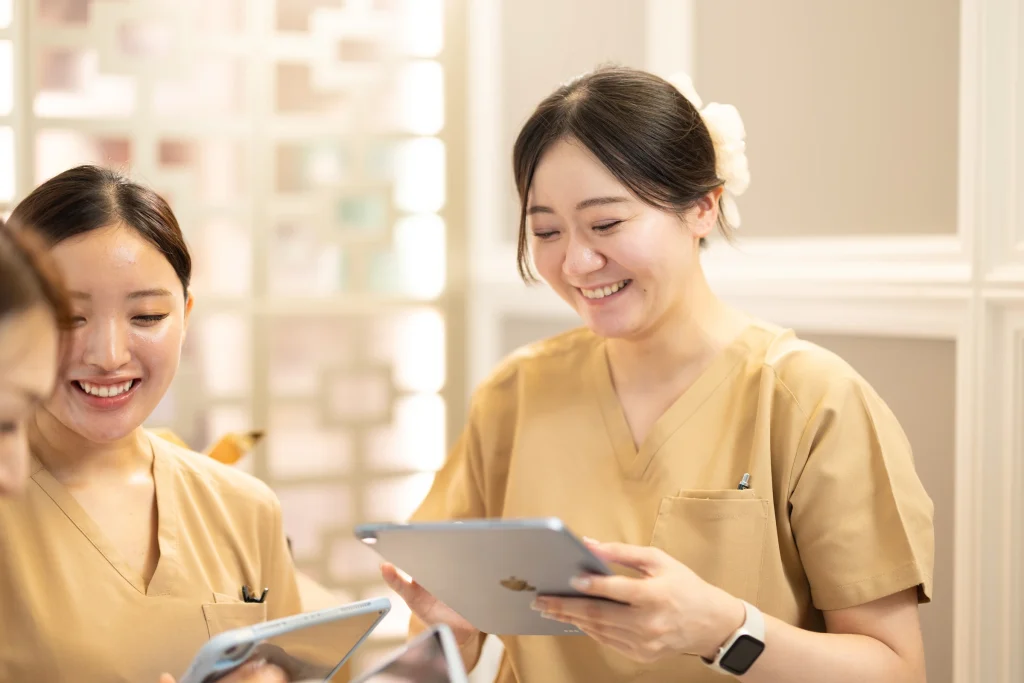 施術をおこなう上で、どんな施術なのか体験することは、お客様へのサービス提供において非常に重要です。特に、当院は最先端の美容医療をいち早く導入していくことが多いため、スタッフは可能な範囲内で診療メニューを体験することを推奨しています。美容皮膚科の診療メニューでは定期的なメンテナンスがあってこそ、キレイになれます。施術を提供するスタッフ自身が体験することはお客様の価値提供に繋がります。当院のスタッフは、毎月1回、社割で施術を受けることができます。(自己負担金:0円~)